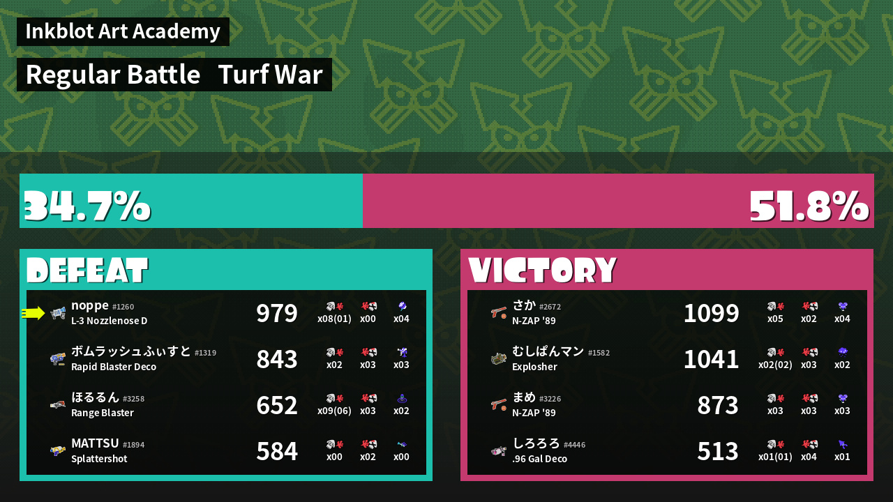 | Medals | #1 Turf Inker #1 Enemy-Base Inker #1 Enemy Splatter | ||