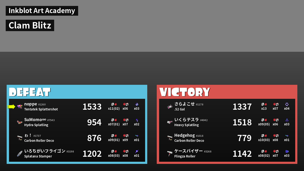 | バンカラな若者 noppe #1260 |  Tentatek Splattershot                    | 1,533 | 9 + 2 | 6 | 1.50 |  3 | |