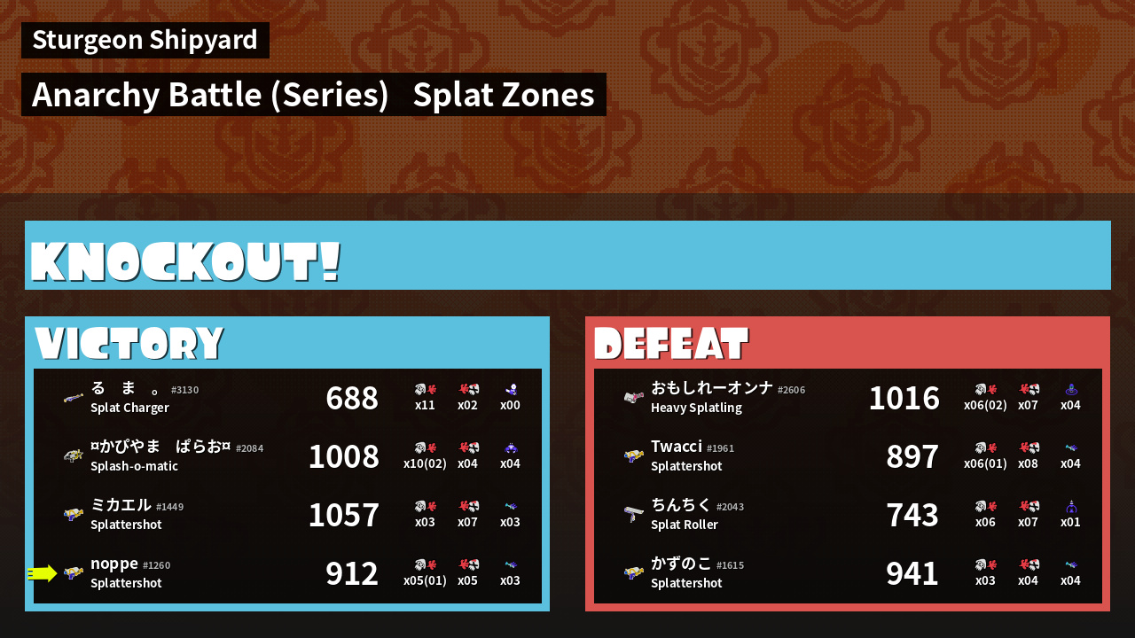 | 笑顔がまぶしいひれおくん る ま 。 #3130 |  Splat Charger                    | 688 | 11 + 0 | 2 | 5.50 |  0 | |