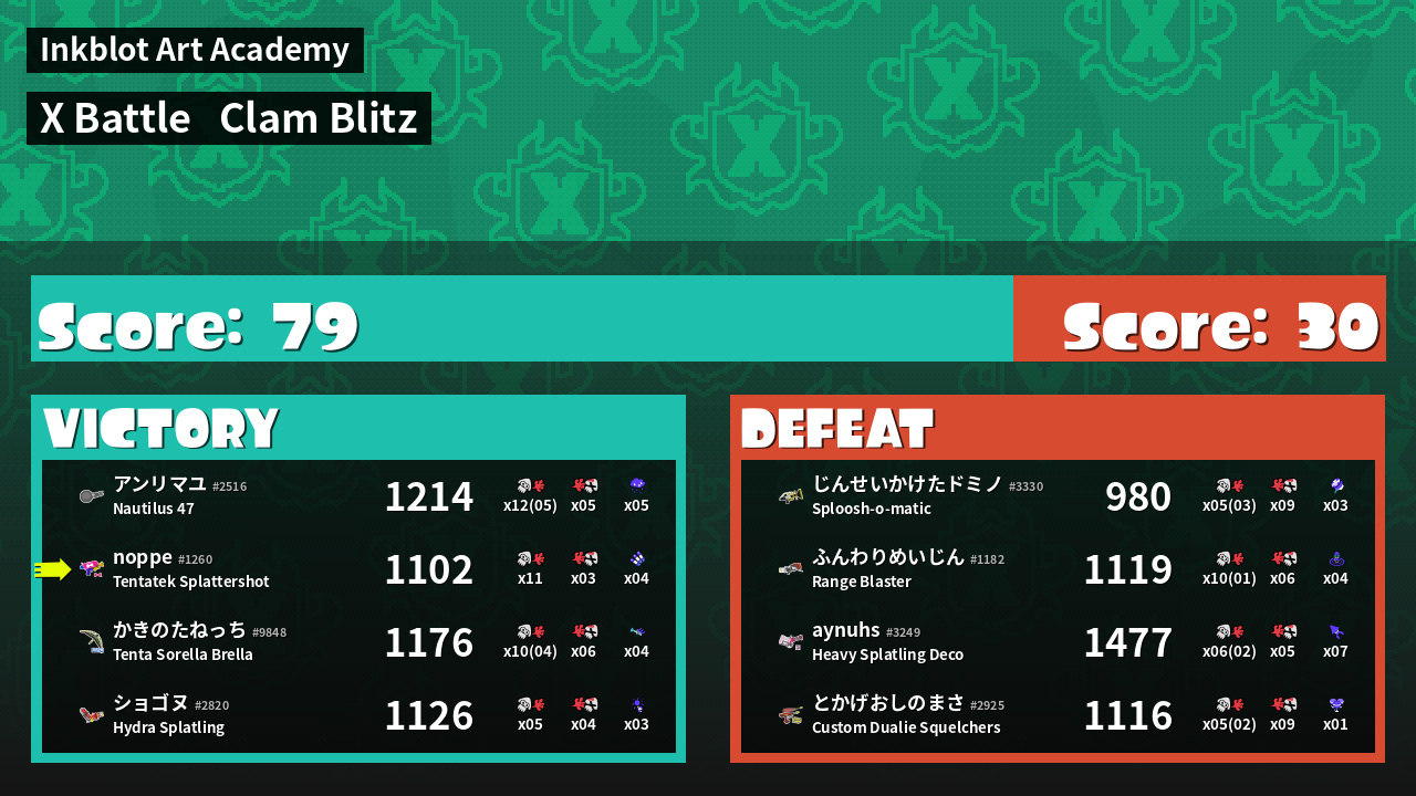 | Medals | #1 Clam Carrier #1 Super Jump Spot #1 Enemy Splatter | ||
