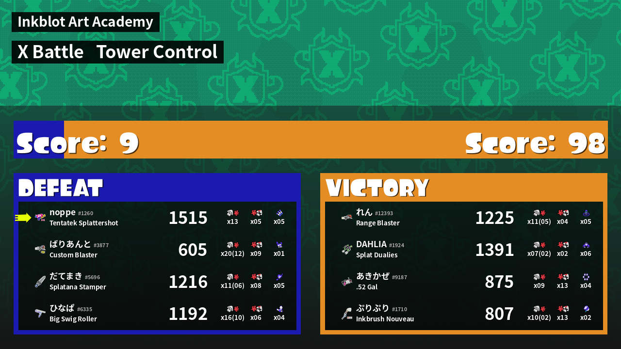 | Medals | #1 Turf Inker #1 Super Jump Spot #1 Enemy Splatter | ||