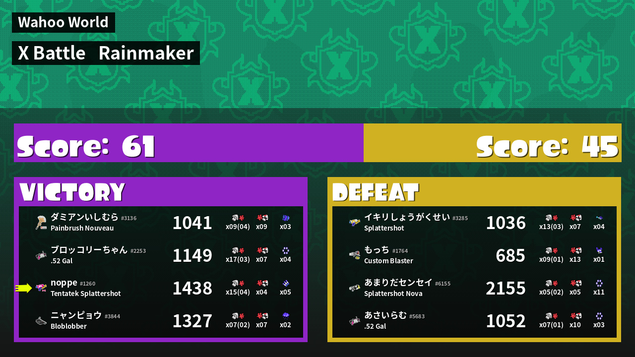| Medals | #1 Turf Inker #1 Splat Assister #1 Rainmaker Stopper | ||