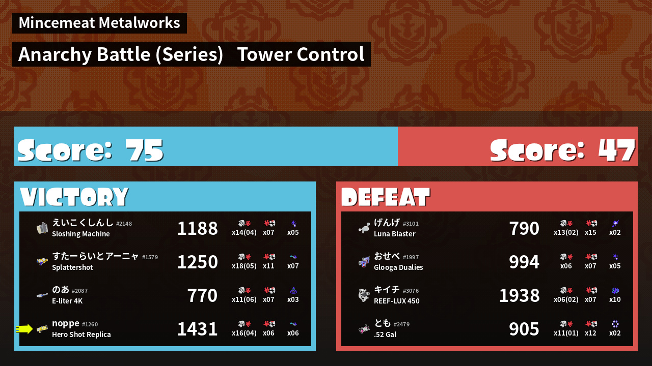| おませな天才 すたーらいとアーニャ #1579 |  Splattershot     | 1,250 | 13 + 5 | 11 | 1.18 |  7 | |