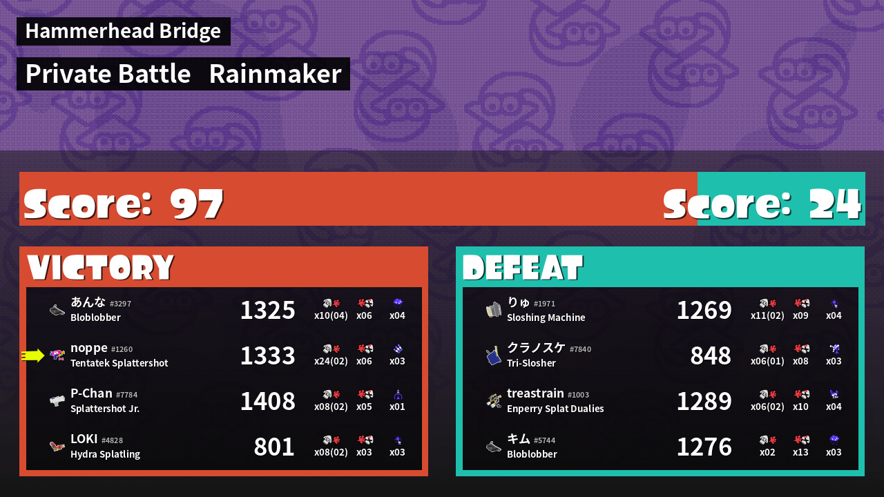 | Medals | #1 Overall Splatter #1 Enemy Splatter #1 Rainmaker Stopper | ||
