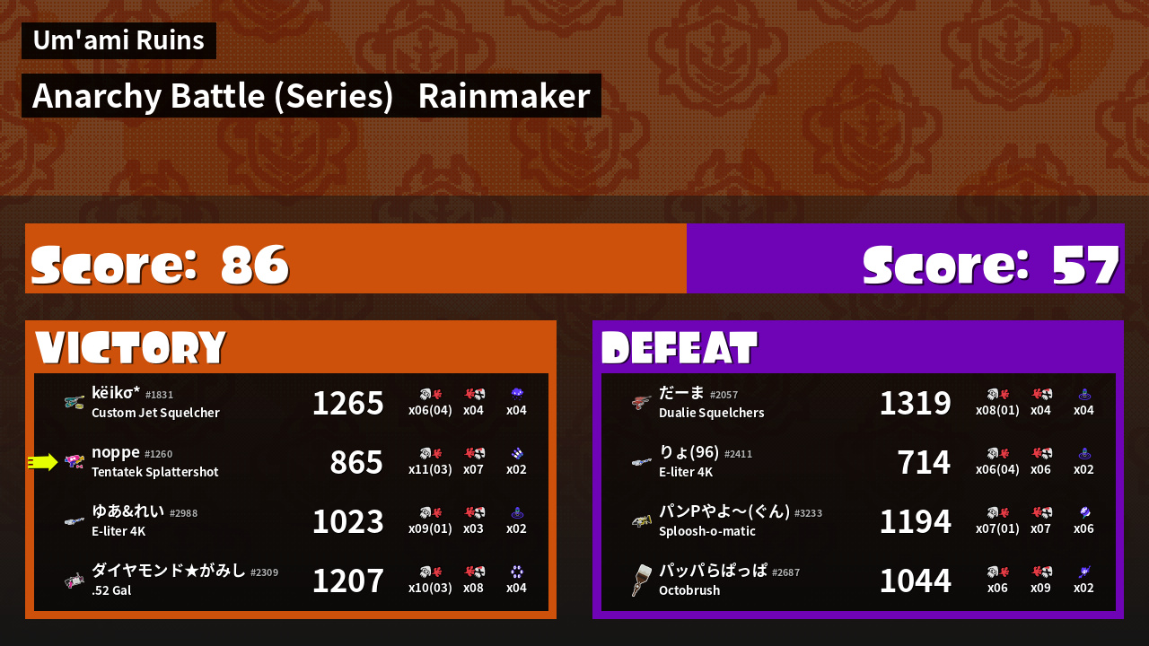 | Medals | #1 Overall Splatter #1 Enemy Splatter #1 Rainmaker Carrier | ||