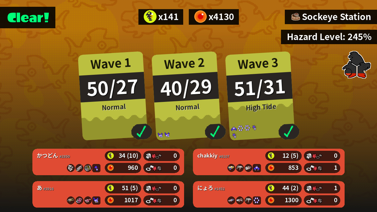 | Weapons | REEF-LUX 450 Dark Tetra Dualies Grizzco Slosher | Sploosh-o-matic Dapple Dualies Rapid Blaster Pro | Splattershot Pro Blaster Grizzco Roller | Splattershot Grizzco Roller Heavy Edit Splatling |