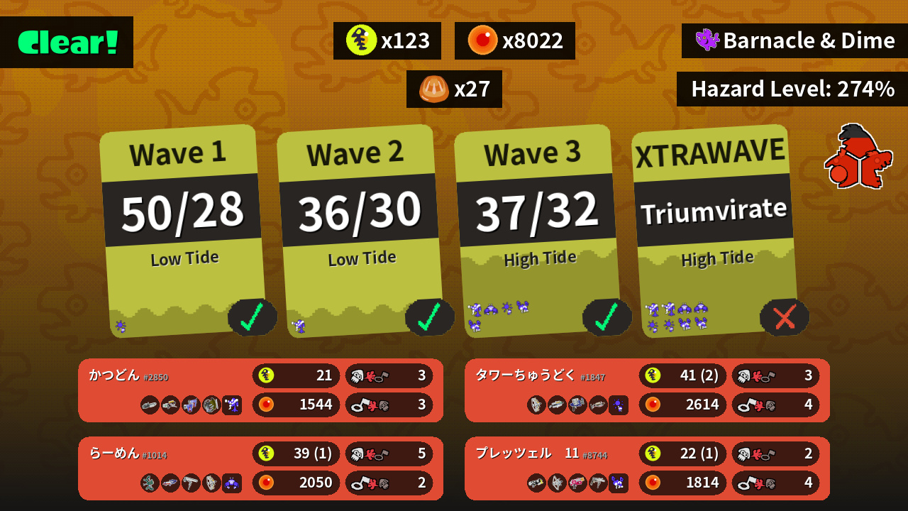 | Weapons | Ballpoint Splatling Grizzco Blaster Glooga Dualies Grizzco Slosher | Grizzco Stringer Grizzco Brella Clash Blaster Grizzco Charger | Wellstring V Splattershot Pro Dynamo Roller Grizzco Stringer | Splattershot Nova Tri-Stringer Rapid Blaster Grizzco Roller |