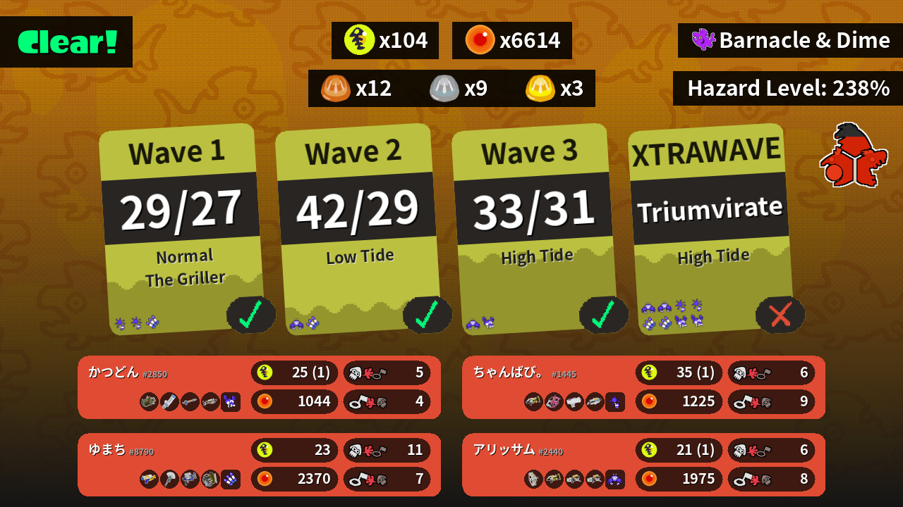 | Weapons | Explosher Mint Decavitator Snipewriter 5H Grizzco Charger | Sploosh-o-matic Dapple Dualies Splattershot Jr. Grizzco Brella | Splattershot Painbrush Clash Blaster Grizzco Slosher | Grizzco Stringer Sploosh-o-matic Grizzco Blaster Grizzco Blaster |