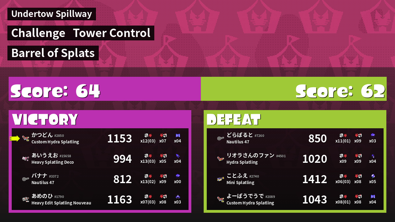 Challenge | Barrel of Splats Muster as much firepower as you can<br />in this battle of the splatlings! | ||