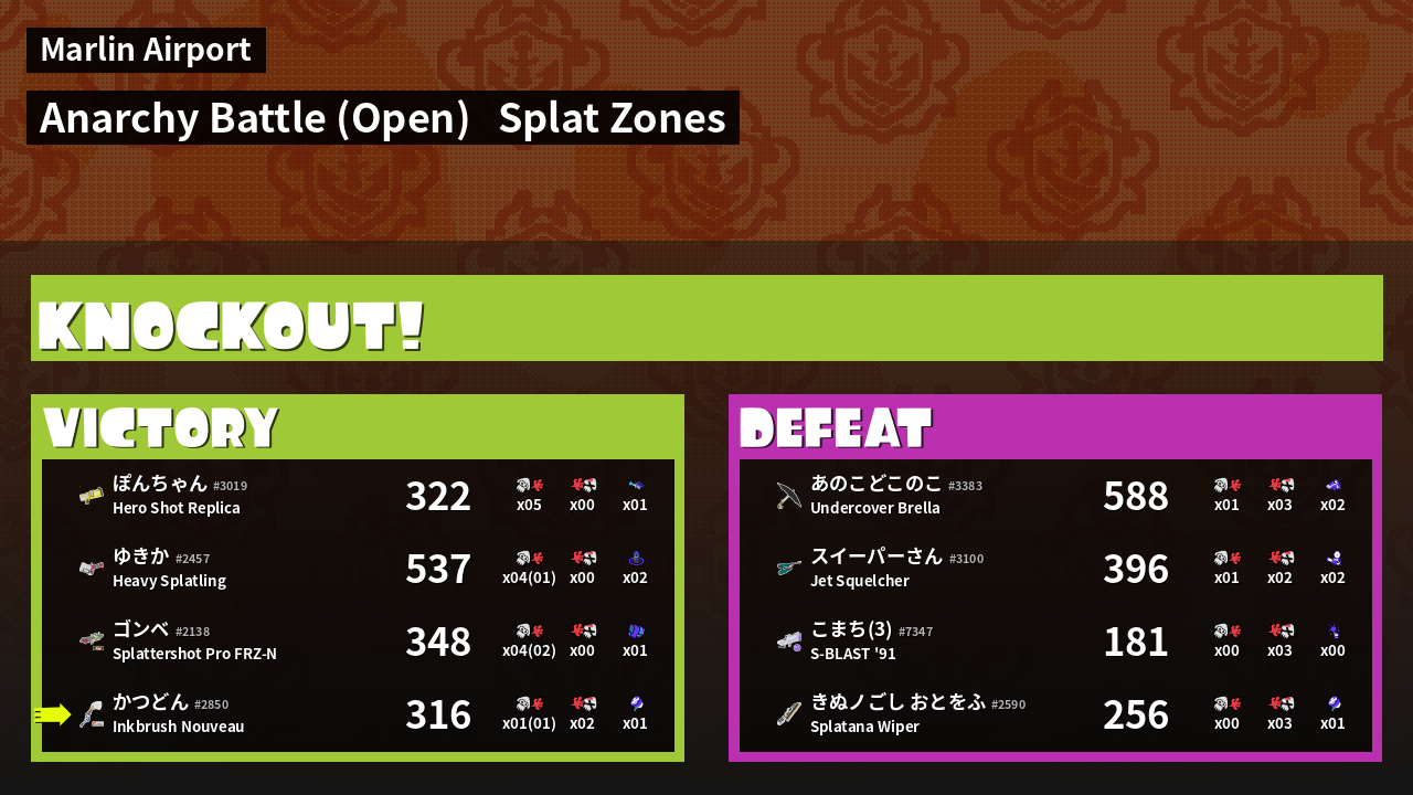 | Mode | Splat Zones - Anarchy Battle (Open) |