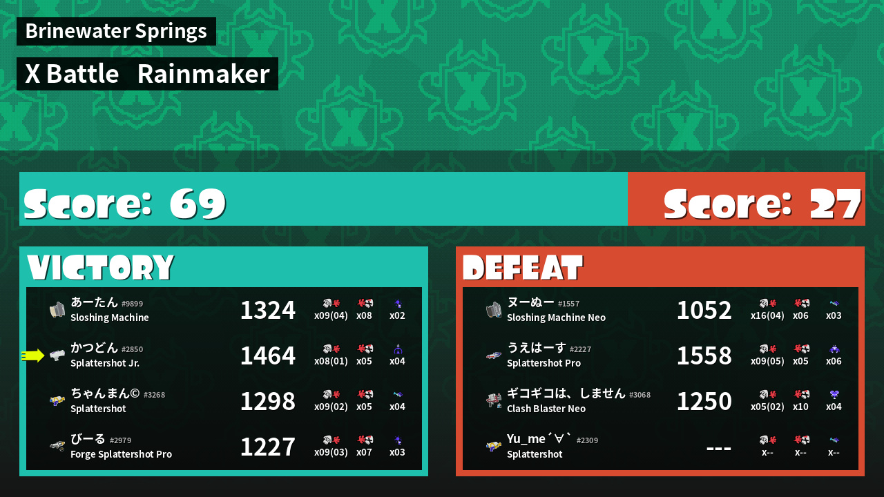 | Medals | #1 Turf Inker #1 Super Jump Spot #1 Enemy Splatter |