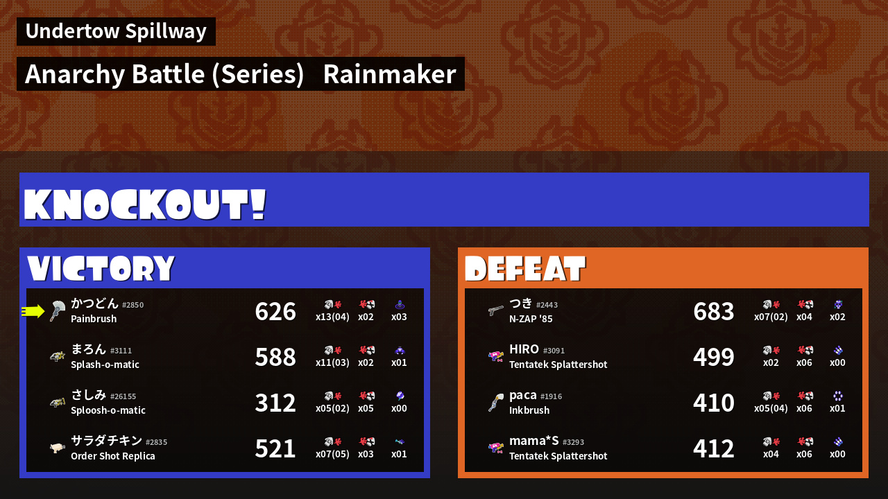 | Medals | #1 Overall Splatter #1 Turf Inker #1 Enemy Splatter |