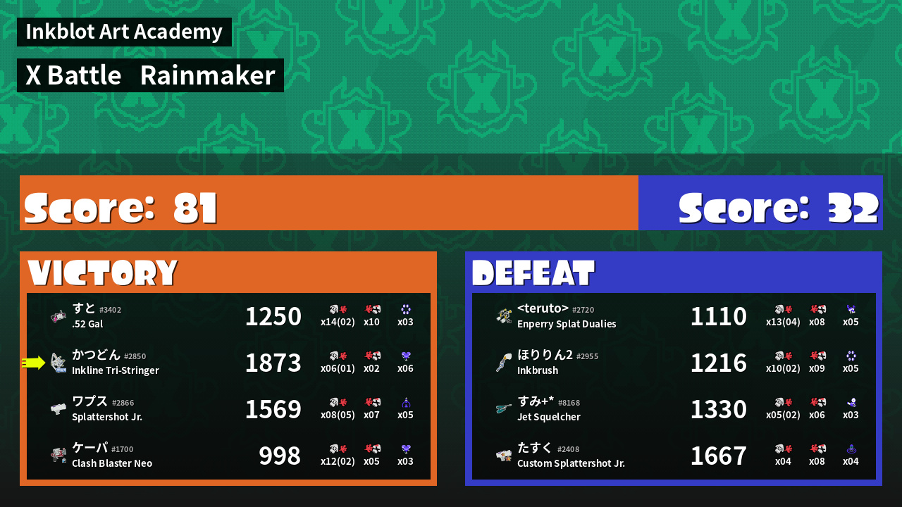 | Weapon | Inkline Tri-Stringer ( Sprinkler / Super Chump) |