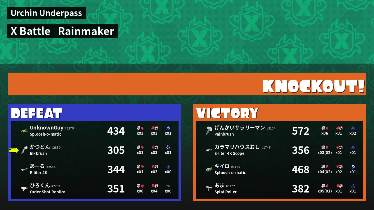 | Weapon | Inkbrush ( Splat Bomb / Killer Wail 5.1) |