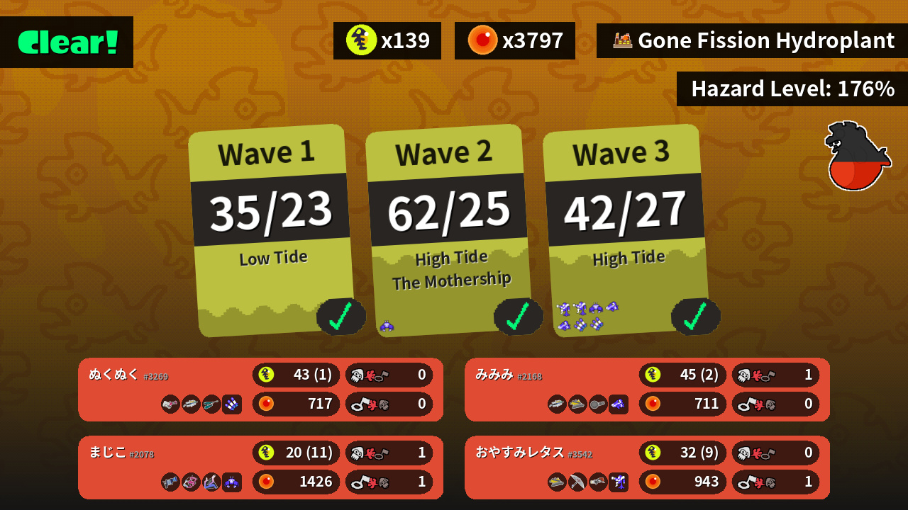 | Weapons |  Heavy Splatling  Grizzco Brella  Jet Squelcher |  Grizzco Brella  Dread Wringer  Nautilus 47 |  Dread Wringer  Splat Brella  Range Blaster |  L-3 Nozzlenose  Dapple Dualies  Slosher |