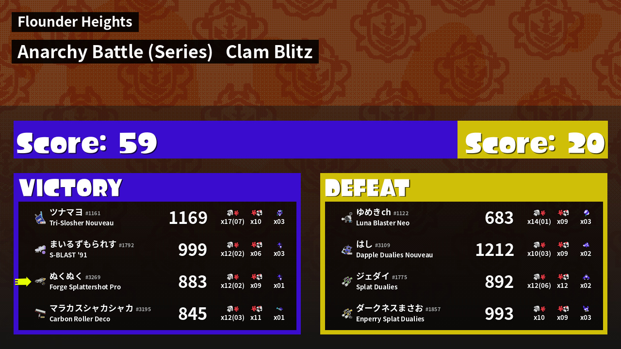 | Medals | #1 Enemy Splatter #2 Overall Splatter #2 Clam Carrier | ||