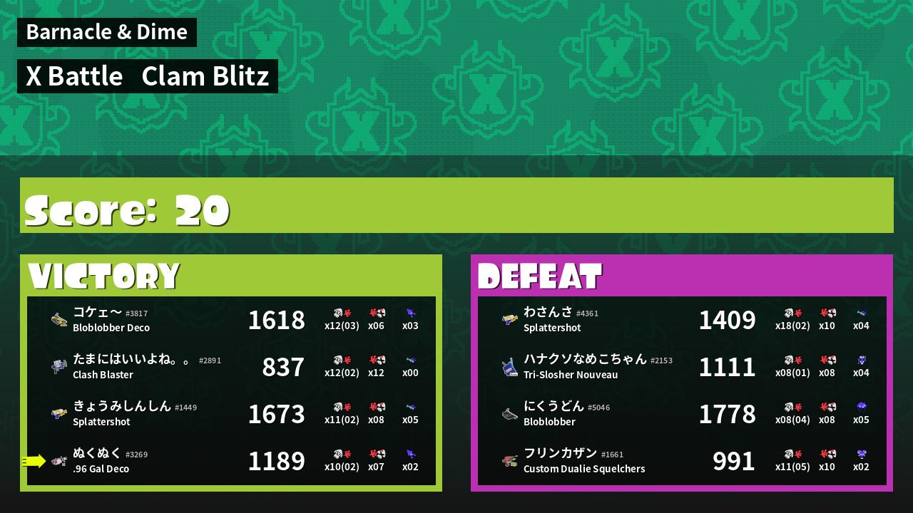 | Mode | Clam Blitz - X Battle | ||