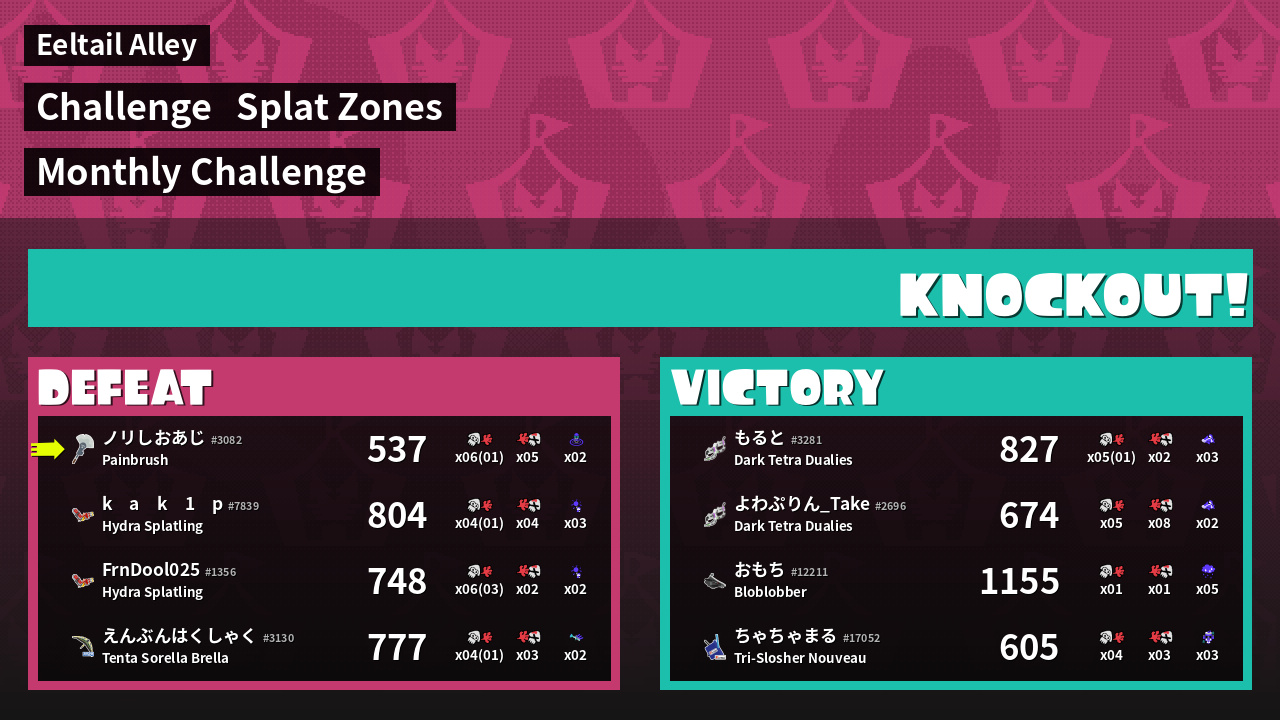 | Medals | #1 Overall Splatter #1 Splat Zone Guard #1 Super Jump Spot | ||
