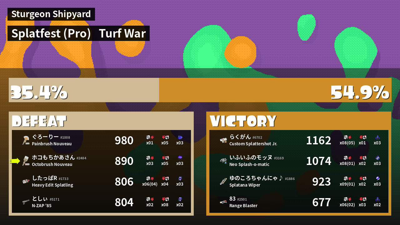 | Medals | #1 Enemy-Base Inker #1 Enemy Splatter #1 Ground Traveler | ||