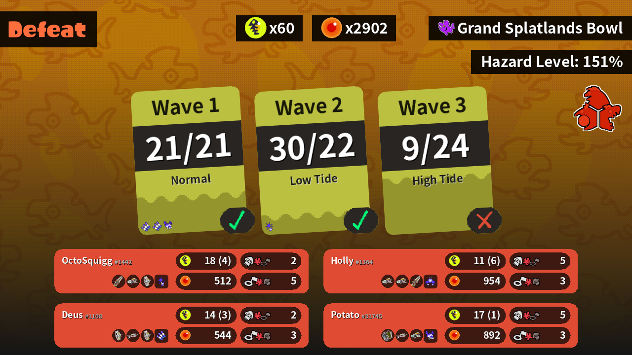 | Weapons | Grizzco Splatana Grizzco Blaster Grizzco Stringer | Grizzco Slosher Grizzco Charger Grizzco Blaster | Grizzco Stringer Grizzco Charger Grizzco Stringer | Grizzco Blaster Grizzco Blaster Grizzco Splatana |