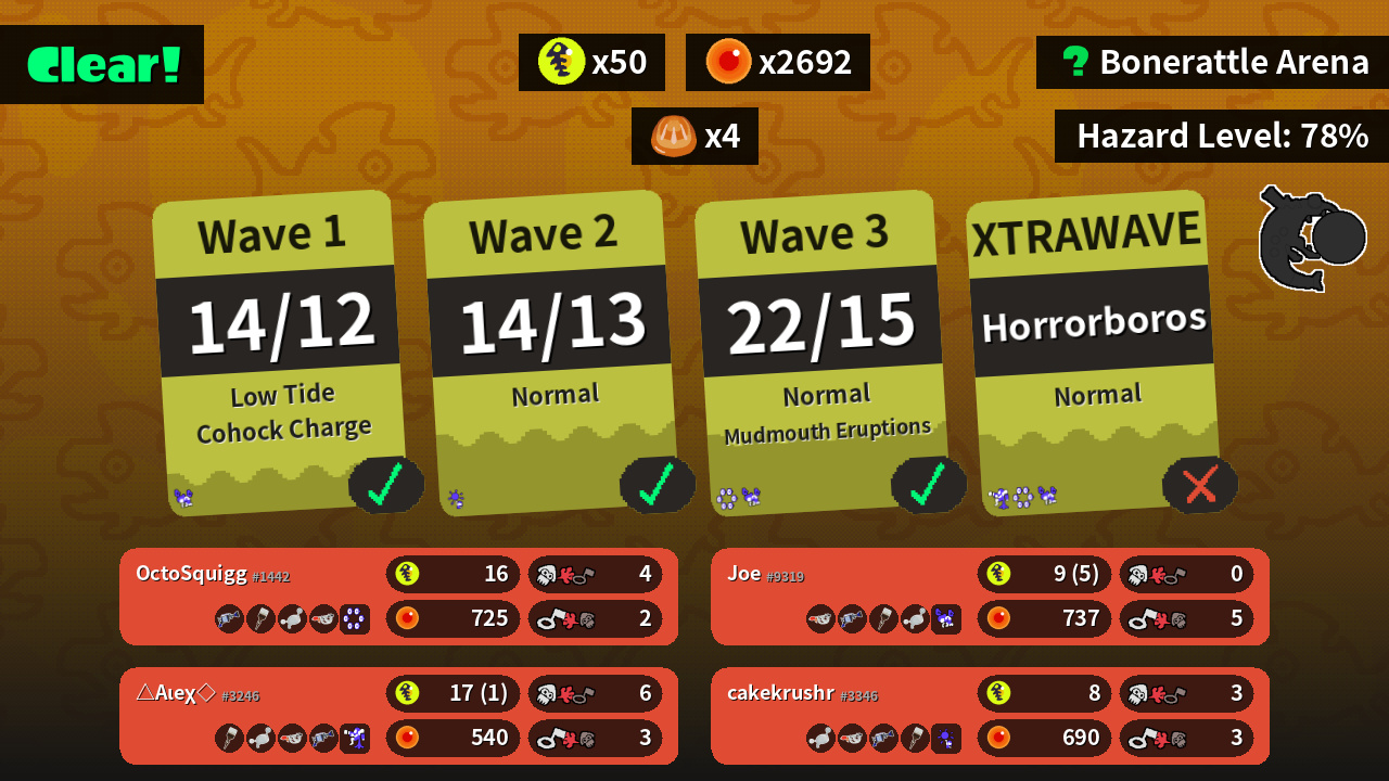 | Weapons | H-3 Nozzlenose Octobrush Luna Blaster Goo Tuber | Octobrush Luna Blaster Goo Tuber H-3 Nozzlenose | Goo Tuber H-3 Nozzlenose Octobrush Luna Blaster | Luna Blaster Goo Tuber H-3 Nozzlenose Octobrush |