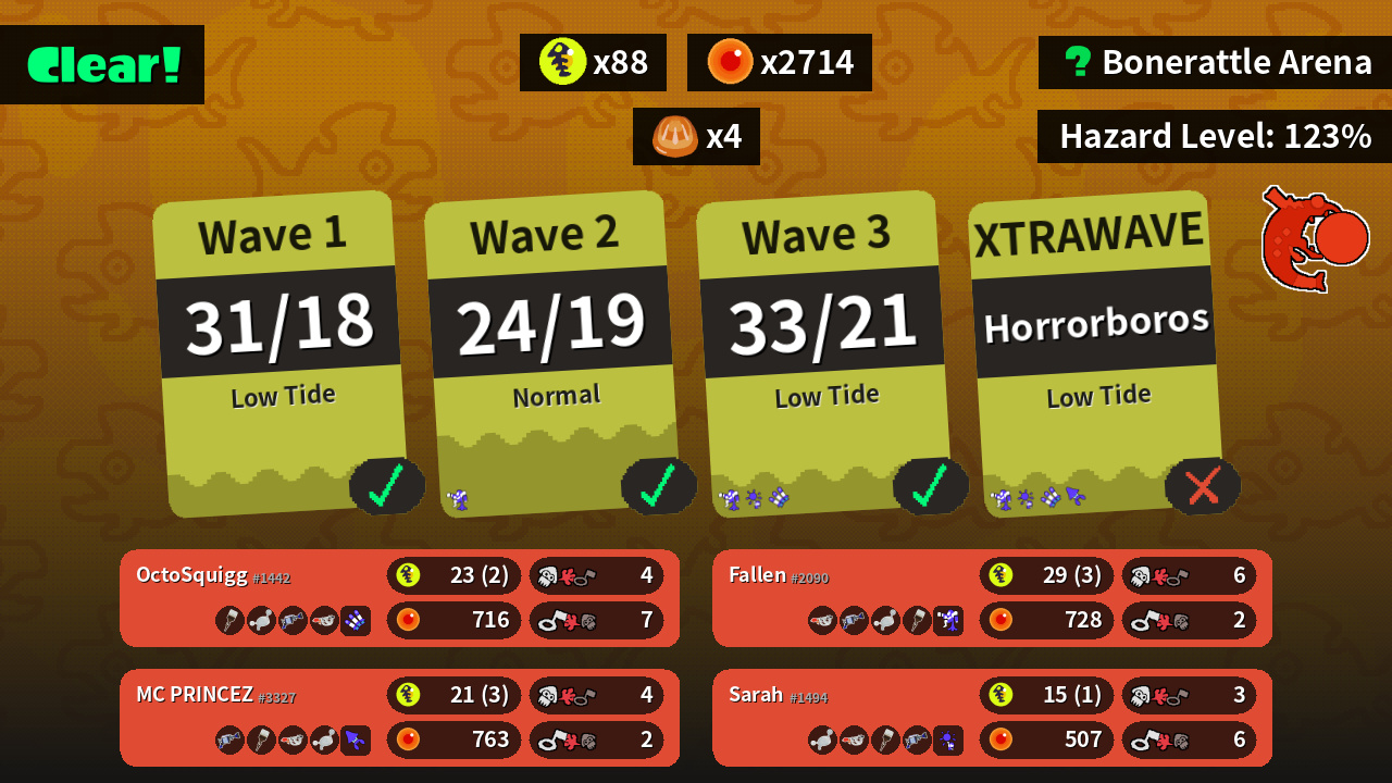 | Weapons | Octobrush Luna Blaster H-3 Nozzlenose Goo Tuber | Goo Tuber H-3 Nozzlenose Luna Blaster Octobrush | H-3 Nozzlenose Octobrush Goo Tuber Luna Blaster | Luna Blaster Goo Tuber Octobrush H-3 Nozzlenose |