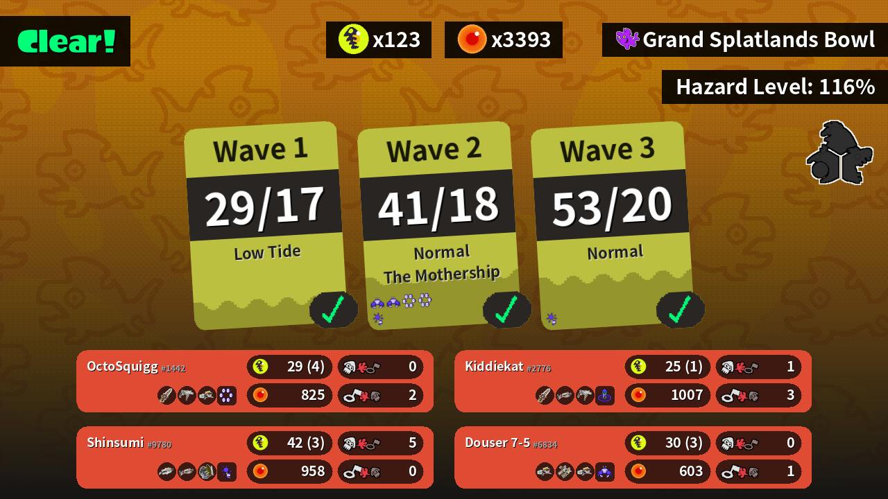 | Weapons | Grizzco Splatana Grizzco Roller Grizzco Blaster | Grizzco Brella Grizzco Charger Grizzco Slosher | Grizzco Blaster Grizzco Dualies Grizzco Blaster | Grizzco Splatana Grizzco Charger Grizzco Roller |