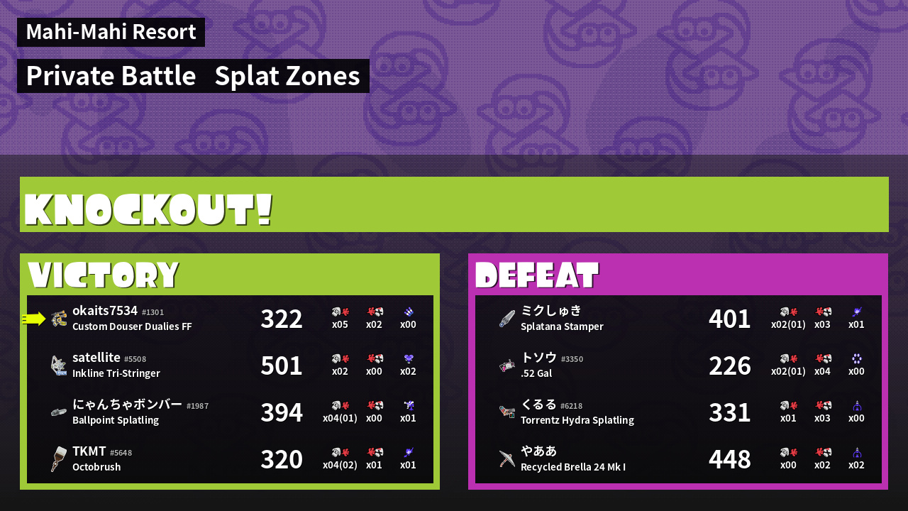 | Mode | Splat Zones - Private Battle | ||