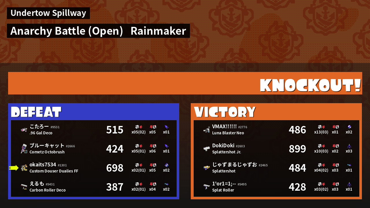 | Weapon | Custom Douser Dualies FF ( Burst Bomb / Triple Inkstrike) | ||