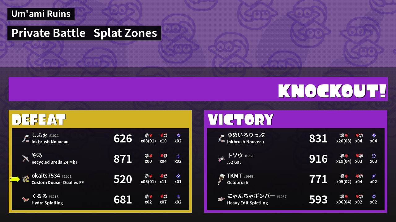 | Mode | Splat Zones - Private Battle | ||