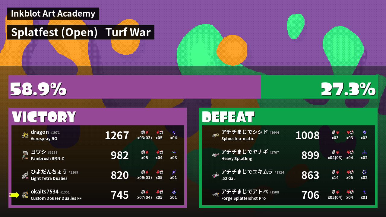 | Medals | #1 Splat Assister #1 Ink Consumer #2 Overall Splatter | ||