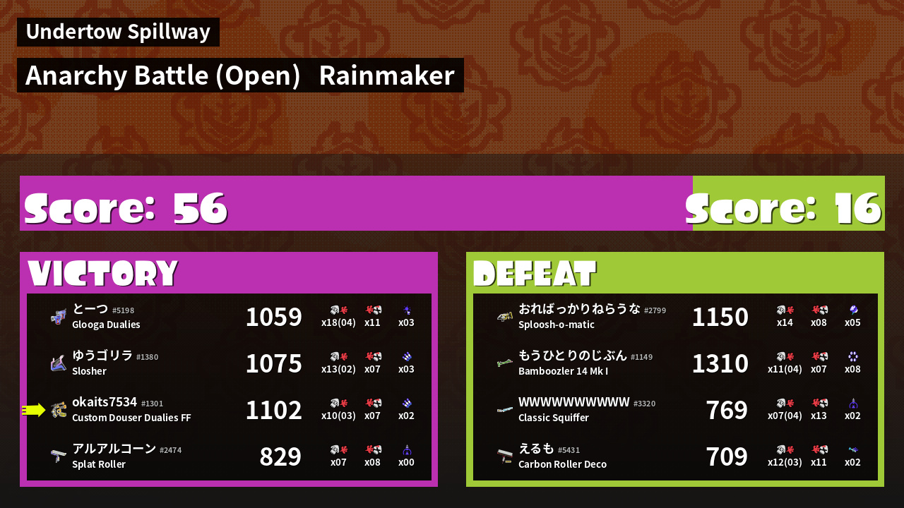 | Weapon | Custom Douser Dualies FF ( Burst Bomb / Triple Inkstrike) | ||