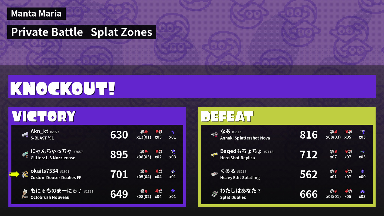 | Mode | Splat Zones - Private Battle | ||