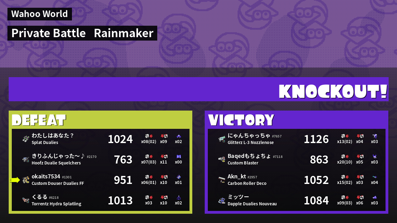 | Weapon | Custom Douser Dualies FF ( Burst Bomb / Triple Inkstrike) | ||