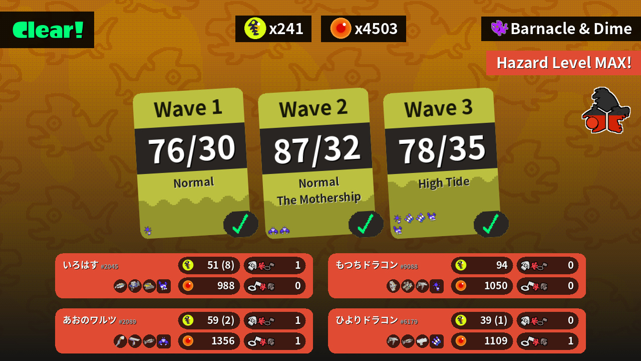 | Weapons | Grizzco Brella Clash Blaster Dread Wringer | Grizzco Stringer Grizzco Dualies Grizzco Roller | Inkbrush Splat Roller Grizzco Charger | Grizzco Roller Grizzco Charger Splattershot Jr. |