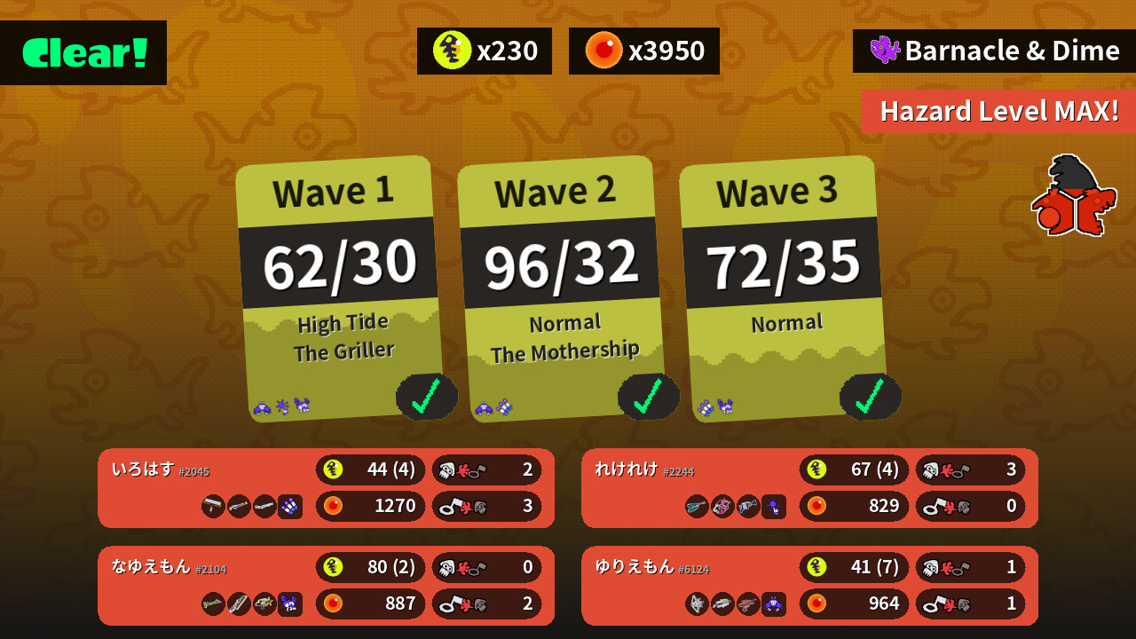 | Weapons | Carbon Roller Splat Charger Classic Squiffer | Bamboozler 14 Mk I Splatana Wiper Splash-o-matic | Jet Squelcher Dapple Dualies H-3 Nozzlenose | Tri-Stringer Grizzco Brella Dualie Squelchers |