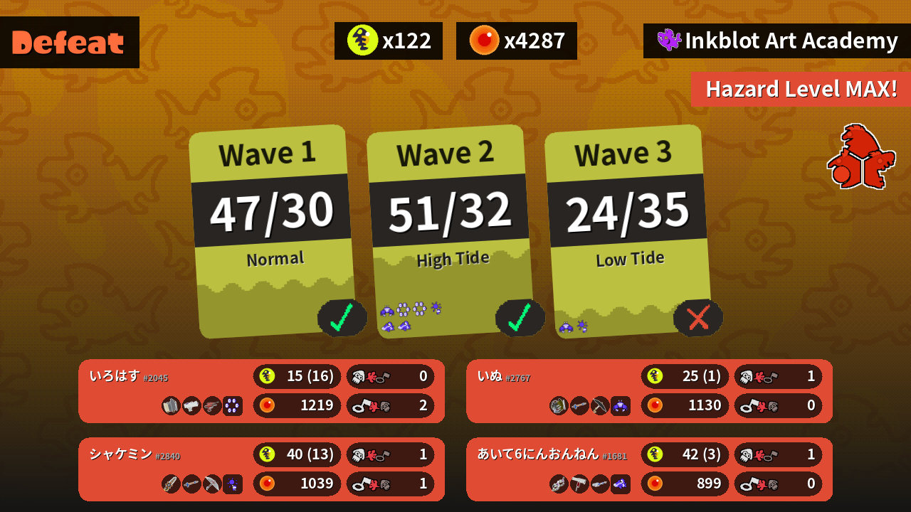 | Weapons | Sloshing Machine Splattershot Jr. Dualie Squelchers | Dark Tetra Dualies Flingza Roller E-liter 4K | Grizzco Splatana Snipewriter 5H Splat Brella | Grizzco Slosher Snipewriter 5H Undercover Brella |