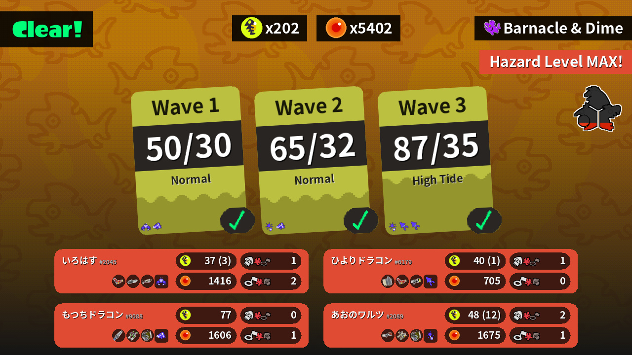 | Weapons | Hydra Splatling Ballpoint Splatling Grizzco Charger | Splatana Stamper Splat Dualies Grizzco Slosher | Range Blaster Grizzco Dualies Grizzco Slosher | Sloshing Machine Hydra Splatling Splattershot Nova |