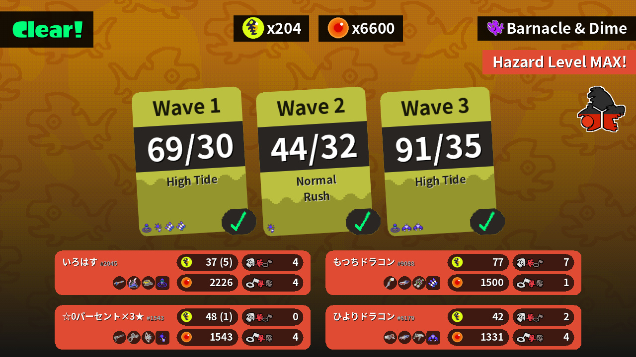 | Weapons | Snipewriter 5H Slosher Dread Wringer | Inkbrush Splattershot Pro Splat Dualies | N-ZAP '85 Aerospray MG Tri-Stringer | Blaster Splattershot Pro Grizzco Roller |