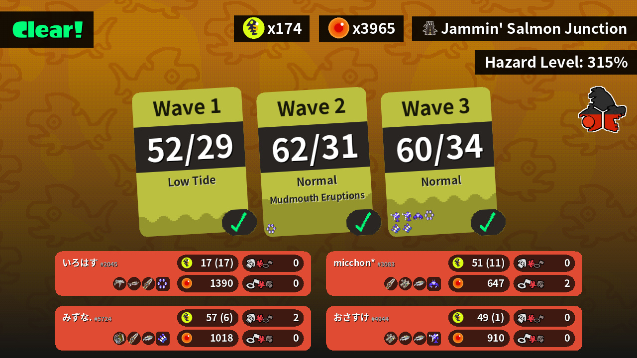 | Weapons | Grizzco Roller Grizzco Charger Grizzco Splatana | Grizzco Slosher Grizzco Splatana Grizzco Brella | Grizzco Splatana Grizzco Dualies Grizzco Brella | Grizzco Dualies Grizzco Brella Grizzco Brella |