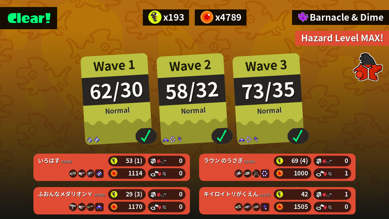 | Weapons | Splattershot Nova Heavy Splatling H-3 Nozzlenose | .52 Gal Grizzco Brella Undercover Brella | Grizzco Blaster Splattershot Pro Grizzco Charger | Dynamo Roller Heavy Splatling Bamboozler 14 Mk I |