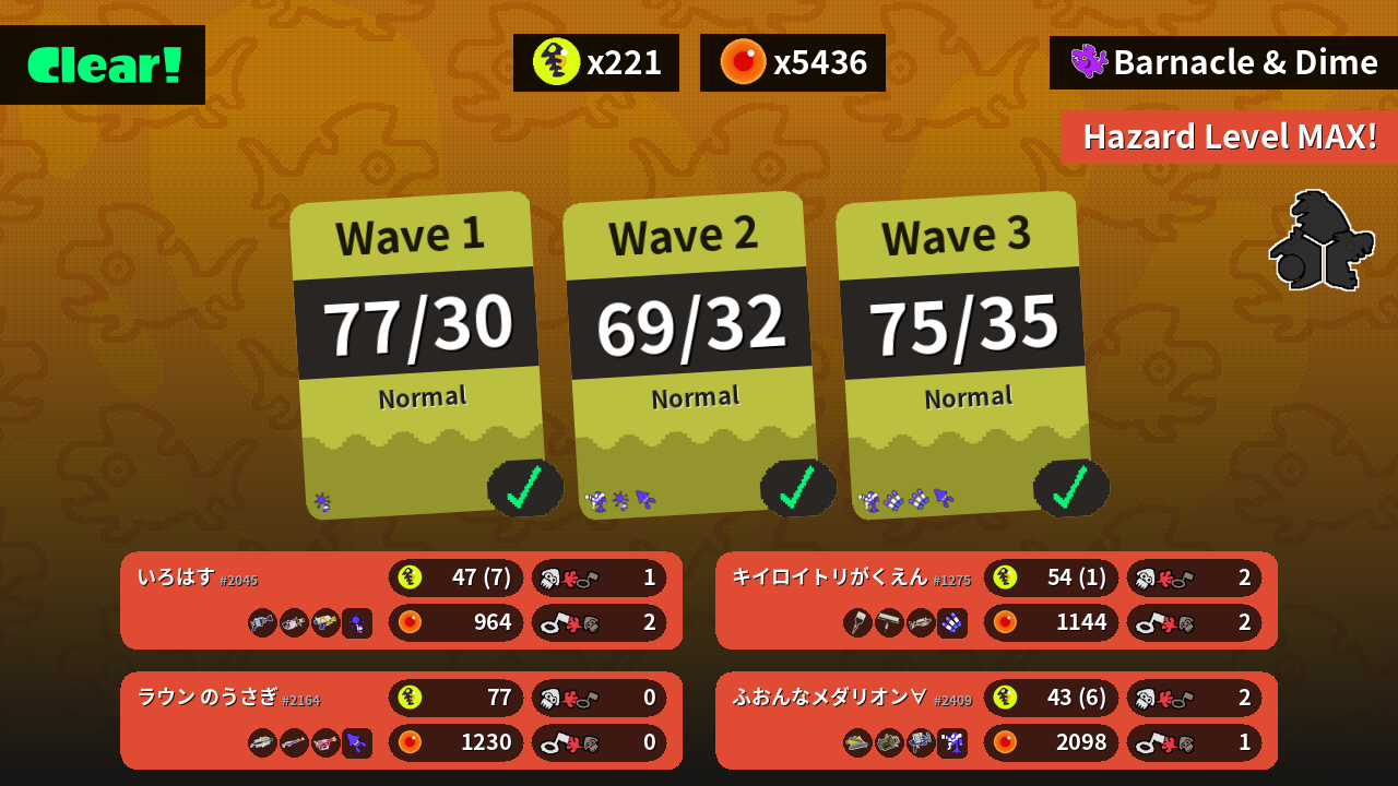 | Weapons | H-3 Nozzlenose .96 Gal Splattershot | Grizzco Brella Splat Charger Rapid Blaster Pro | Octobrush Carbon Roller Grizzco Charger | Dread Wringer Explosher Clash Blaster |