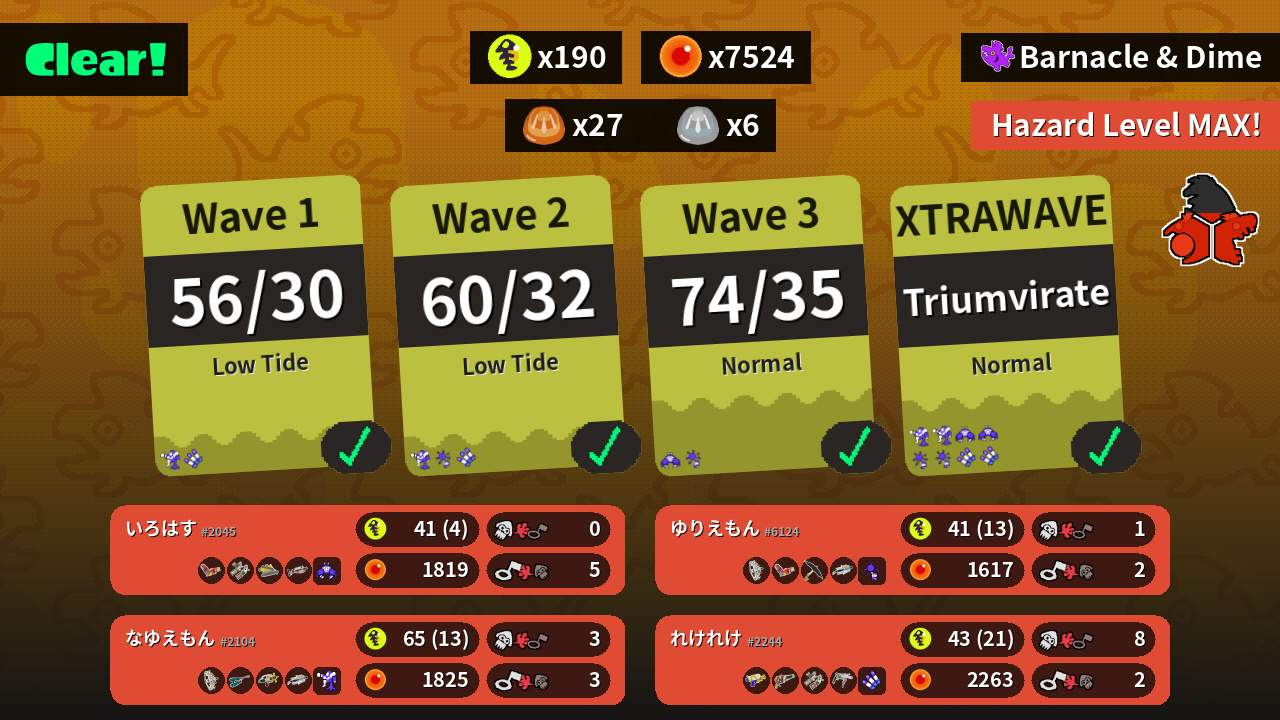 | Weapons | Hydra Splatling Grizzco Dualies Dread Wringer Grizzco Charger | Grizzco Stringer Jet Squelcher Splash-o-matic Grizzco Brella | Splattershot Squeezer Grizzco Dualies Grizzco Roller | Grizzco Stringer Hydra Splatling Undercover Brella Grizzco Brella |