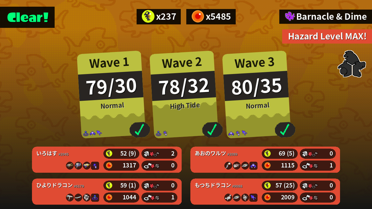 | Weapons | Sploosh-o-matic Clash Blaster Splattershot | Inkbrush Heavy Edit Splatling Grizzco Brella | Dynamo Roller Classic Squiffer REEF-LUX 450 | Luna Blaster Grizzco Brella Tri-Stringer |