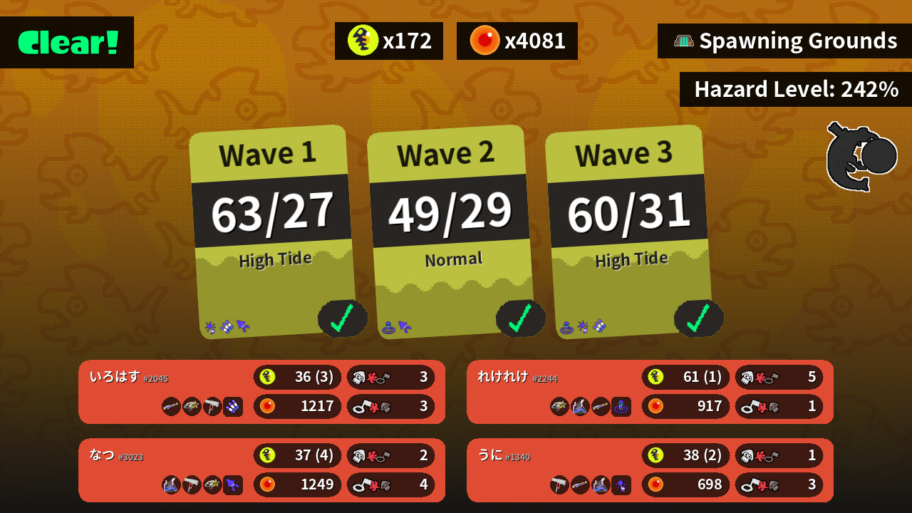 | Weapons | Splat Charger Splash-o-matic Flingza Roller | Splash-o-matic Slosher Splat Charger | Flingza Roller Splat Charger Slosher | Slosher Flingza Roller Splash-o-matic |