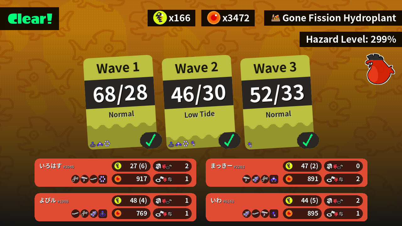 | Weapons | Aerospray MG Splat Roller Classic Squiffer | Classic Squiffer Aerospray MG Glooga Dualies | Splat Roller Glooga Dualies Aerospray MG | Glooga Dualies Classic Squiffer Splat Roller |