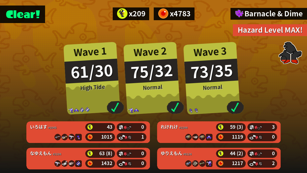 | Weapons | Snipewriter 5H Mini Splatling Big Swig Roller | Big Swig Roller Luna Blaster Heavy Edit Splatling | Splash-o-matic Goo Tuber Splash-o-matic | L-3 Nozzlenose Grizzco Dualies Bamboozler 14 Mk I |