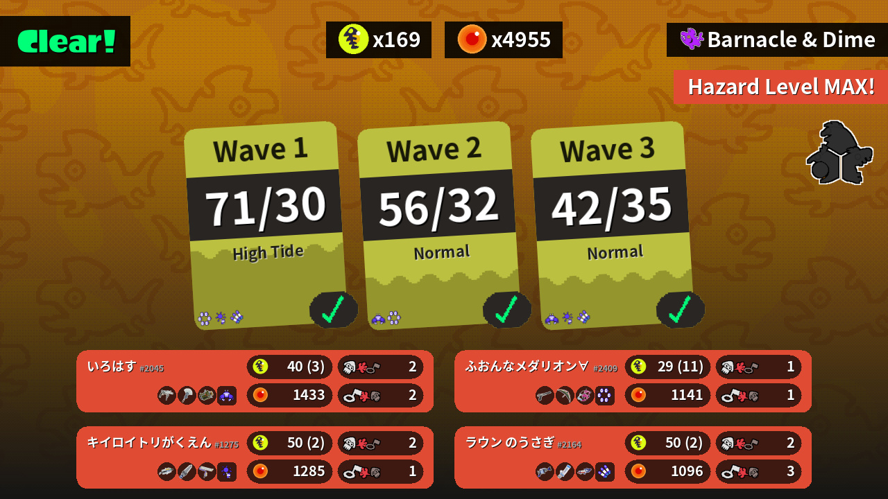| Weapons | Grizzco Roller Painbrush Explosher | Grizzco Brella Splatana Stamper Splat Roller | H-3 Nozzlenose Mint Decavitator Splattershot Pro | N-ZAP '85 Tenta Brella Dapple Dualies |