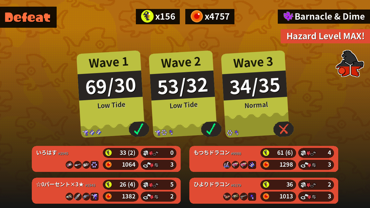 | Weapons | .52 Gal E-liter 4K Heavy Edit Splatling | Slosher Rapid Blaster Rapid Blaster | Hydra Splatling Sploosh-o-matic N-ZAP '85 | Grizzco Blaster Splatana Stamper H-3 Nozzlenose |
