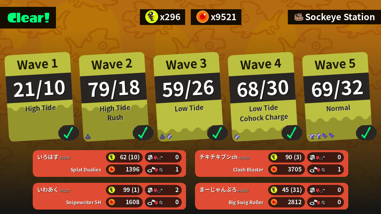 | Weapons | Splat Dualies | Snipewriter 5H | Clash Blaster | Big Swig Roller |